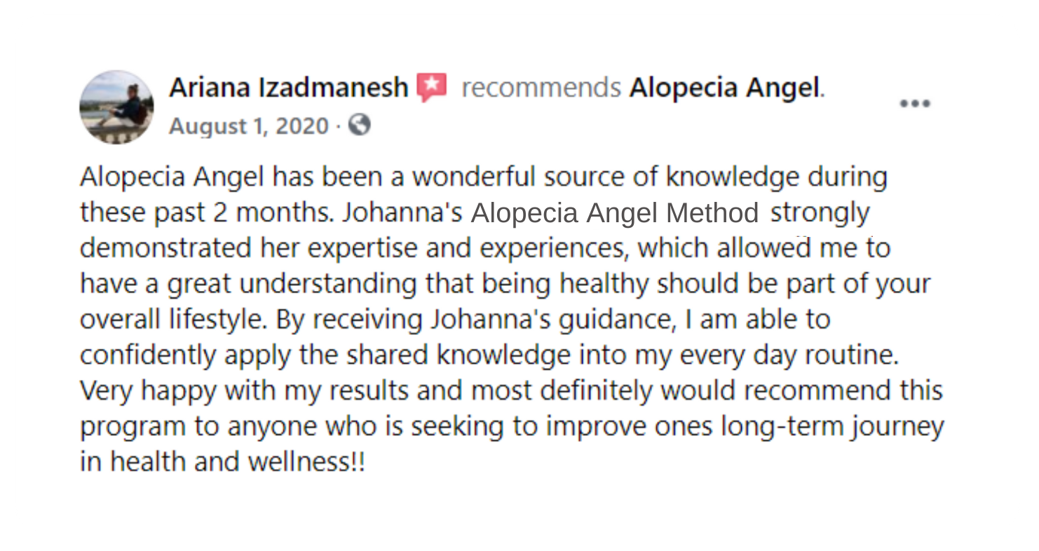 Couldn’t be happier Alopecia Angel has been a wonderful source of knowledge during these past 2 months. Johanna’s signature program strongly demonstrated her expertise and experiences, which allowed me to have a great understanding that being healthy should be part of your overall lifestyle. By receiving Johanna’s guidance, I am able to confidently apply the shared knowledge into my every day routine. Very happy with my results and most definitely would recommend this program to anyone who is seeking to improve ones long-term journey in health and wellness!!