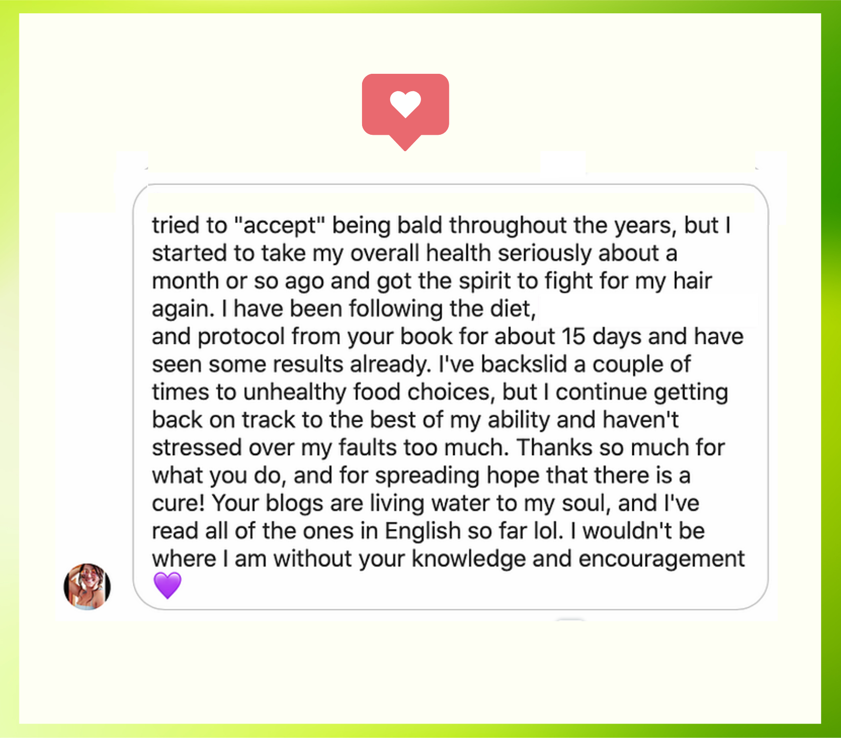 This has been the best investment ever and I am so thankful and have so much trust in you. Your responses have been fast and helpful. I saw hair growth in week 2. This has been a long way for me because my body was in full attack mode. Seeing progress and the fact that the hair has been growing through this process is wonderful.