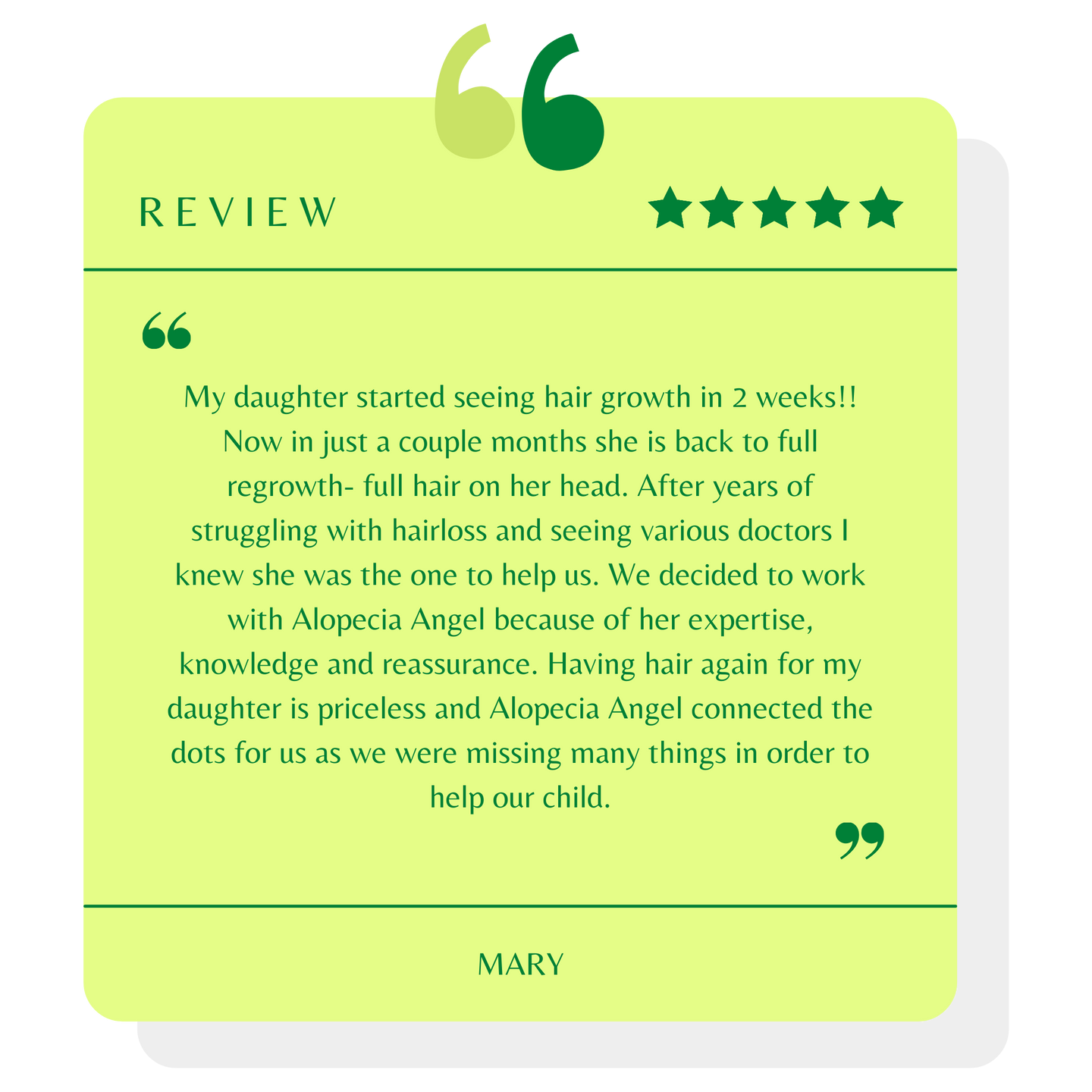My daughter started seeing hair growth in 2 weeks!! Now in just a couple months she is back to full regrowth- full hair on her head. After years of struggling with hair loss and seeing various doctors I knew she was the one to help us. We decided to work with Alopecia Angel because of her expertise, knowledge and reassurance. Having hair again for my daughter is priceless and Alopecia Angel connected the dots for us as we were missing many things in order to help our child.
